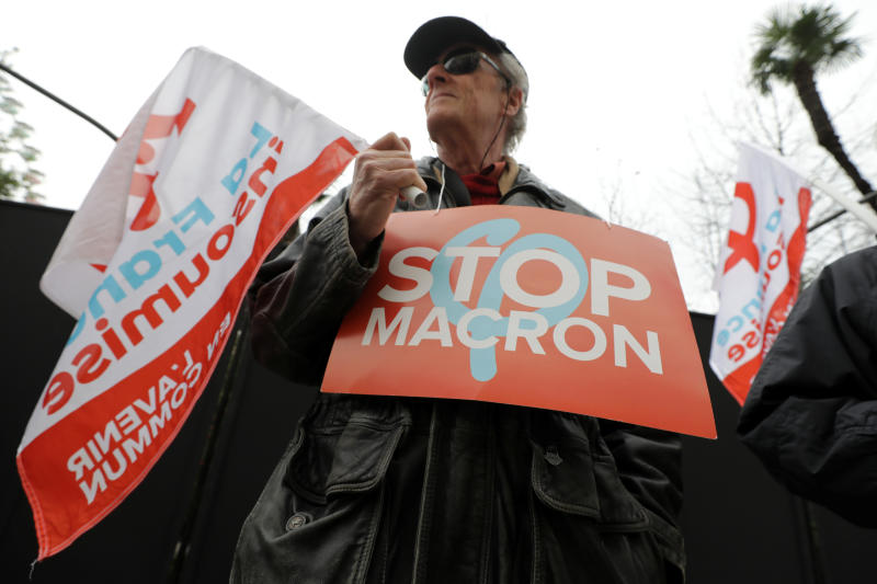 A protester holds a placard that reads "Stop Macron" during a demonstration against the French government's pension reform plans in Nice as part of a national strike and day of protests in France, on Dec 5, 2019.