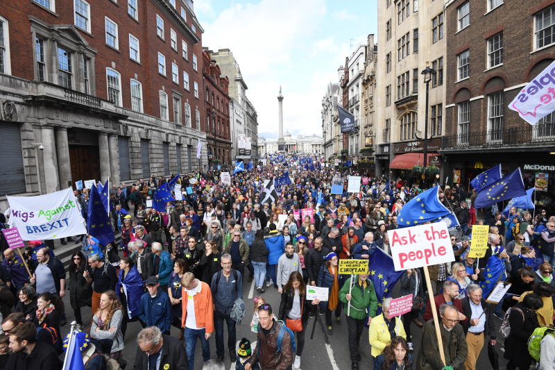Protesters march against Brexit in London on Oct 19, 2019.