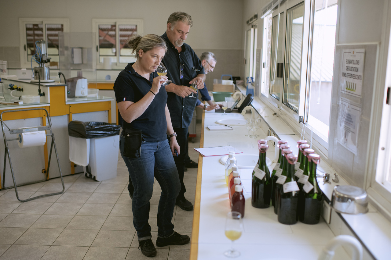 Helene Barre, an oenologist, tastes new season wine at a cooperative in Limoux, France, on Aug 27, 2021.