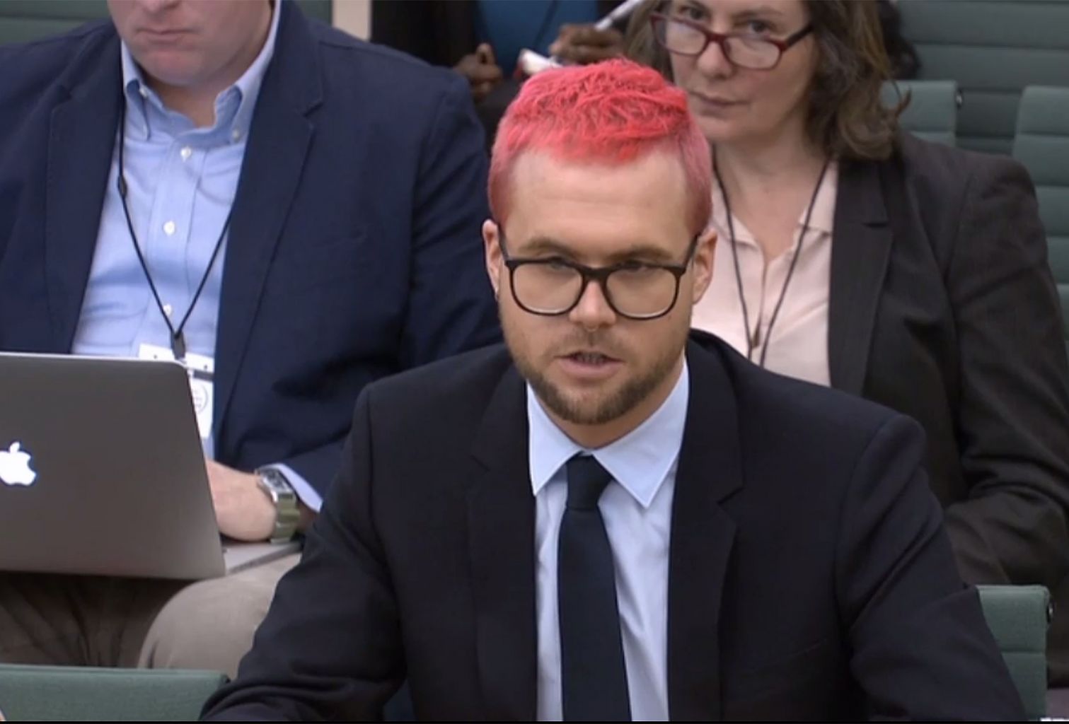 Mr Christopher Wylie, a whistleblower formerly of Cambridge Analytica, appears as a witness before the Digital, Culture, Media and Sport Committee of members of the British parliament in London on March 27, 2018.