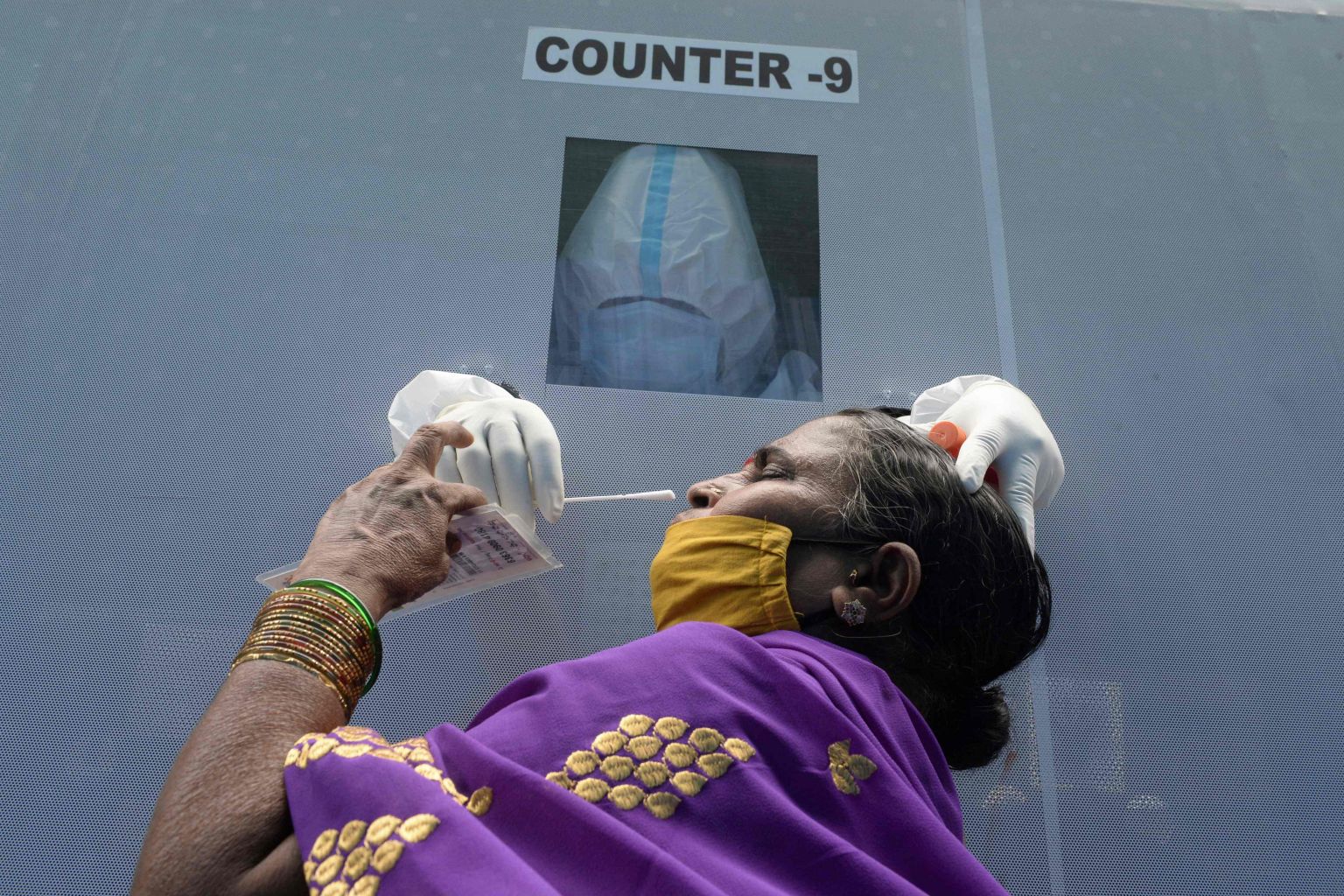 A health worker sits inside a mobile Covid-19 testing bus while collecting a swab sample from a resident in Hyderabad, India.