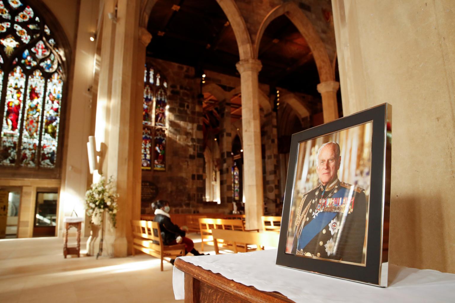 A picture of Britain's Prince Philip rests on a memorial at Sheffield cathedral, in Sheffield, Britain on April 13, 2021.