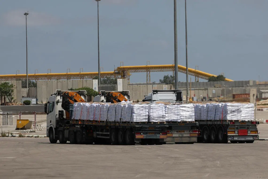 Trucks carrying aid making their way to Gaza at the Kerem Shalom crossing, on the Israeli side of the crossing, on May 19.