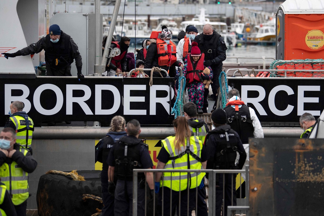 A migrant child leaving UK Border Force vessel BF Hurricane in Dover, England, on Dec 16, 2021.
