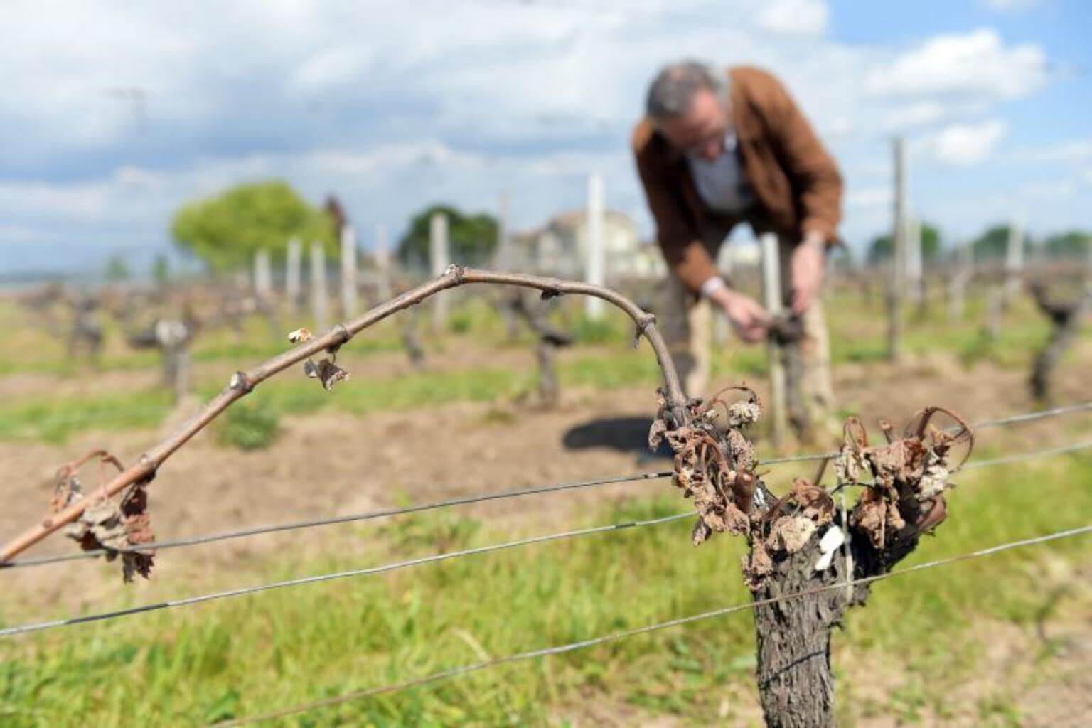 A wine grower checks his vineyards partially destroyed by the frost of late April cold nights on May 3, 2017 in Vignonet.