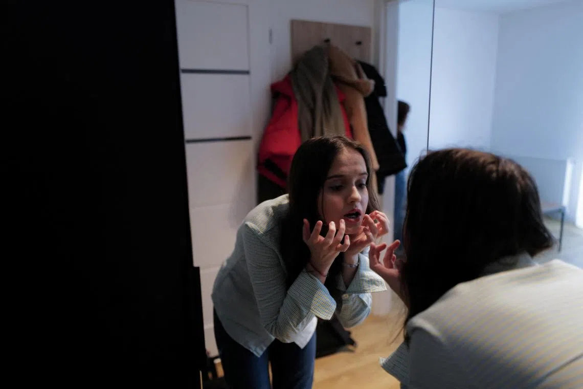 Marharyta Chykalova, who turns 17 in March, getting ready to leave for theatre class at her apartment in Gdynia, Poland.
