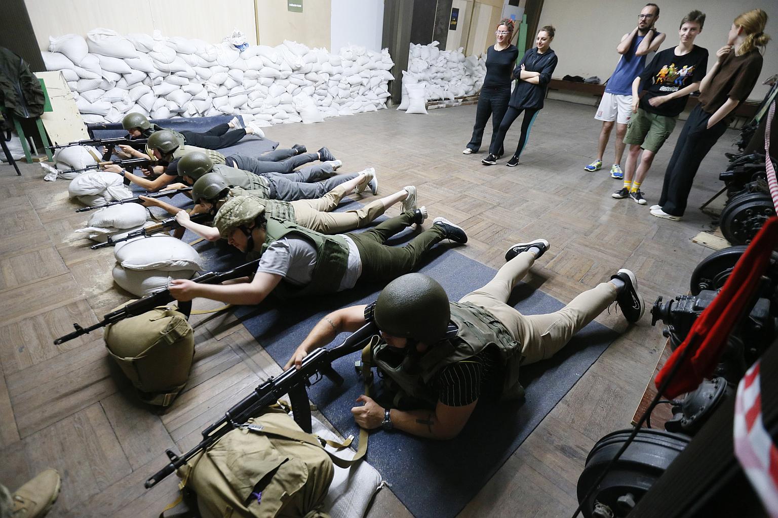 "Every day, including the weekend, I come to make camouflage netting for the army," said Ms Natalia Pinchenkova, 49, behind a large Union flag, a show of thanks to Britain for its support for Ukraine since the conflict erupted.