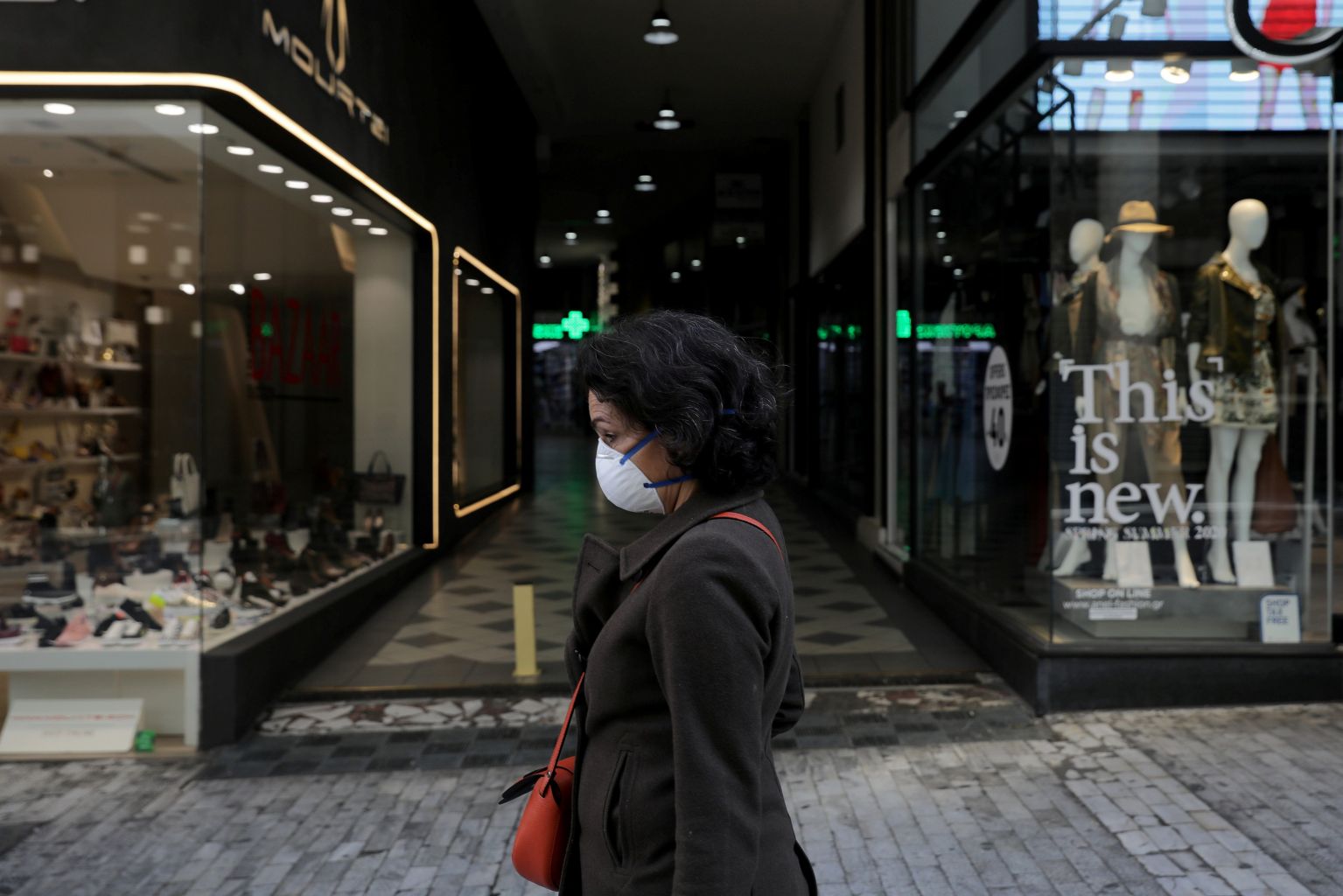 A woman in a protective mask walks outside a closed store on the main commercial Ermou Street in Athens.