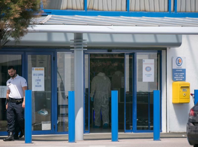 A French forensic police officer walks into the supermarket where two people were injured when a woman shouting "Allahu akbar" (God is greatest) attacked them with a boxcutter on June 17, 2018 in La Seyne-sur-Mer, southern France.