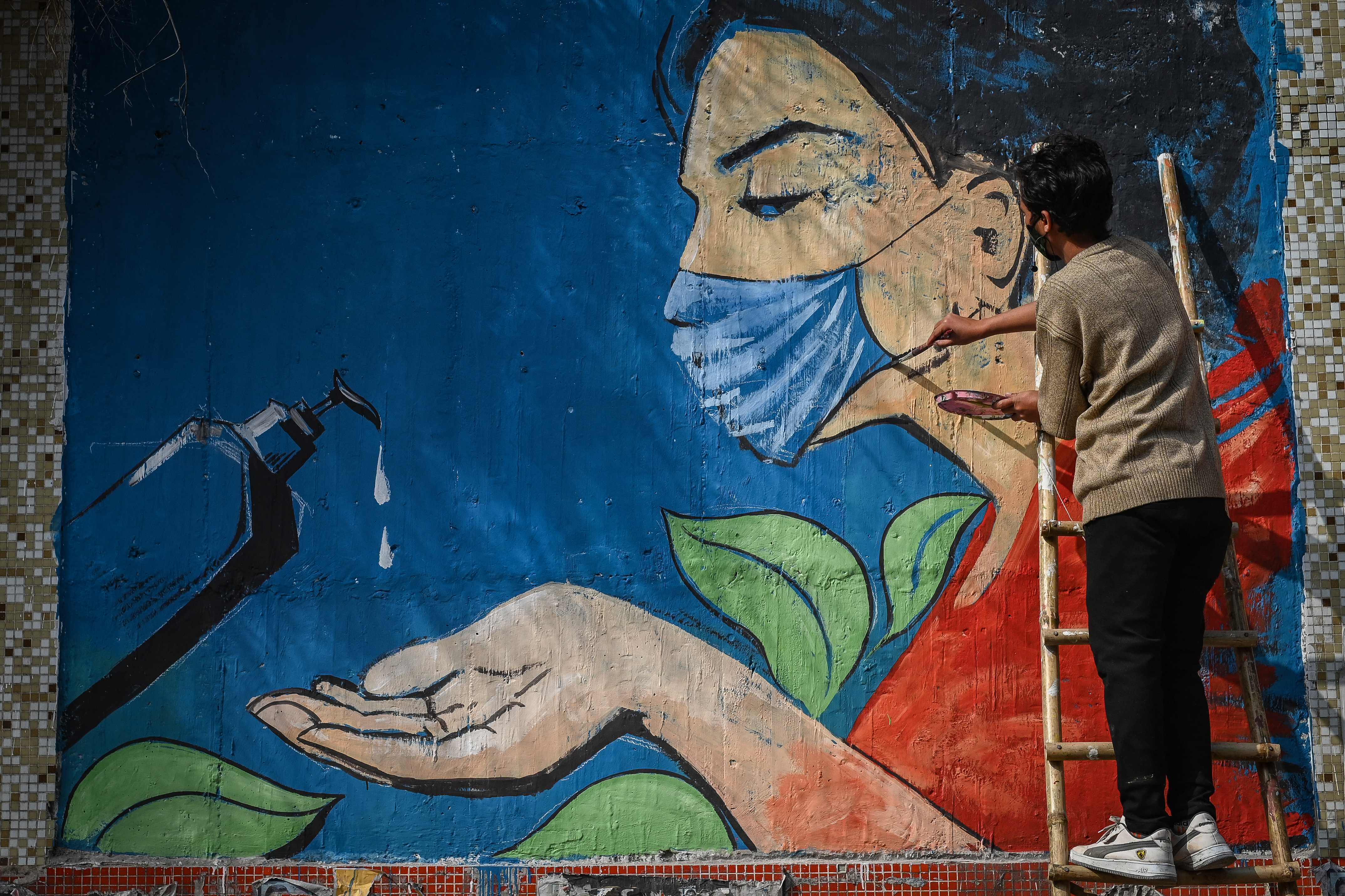 An artist paints a mural on the walls of an underpass in New Delhi, on Jan 16, 2022.