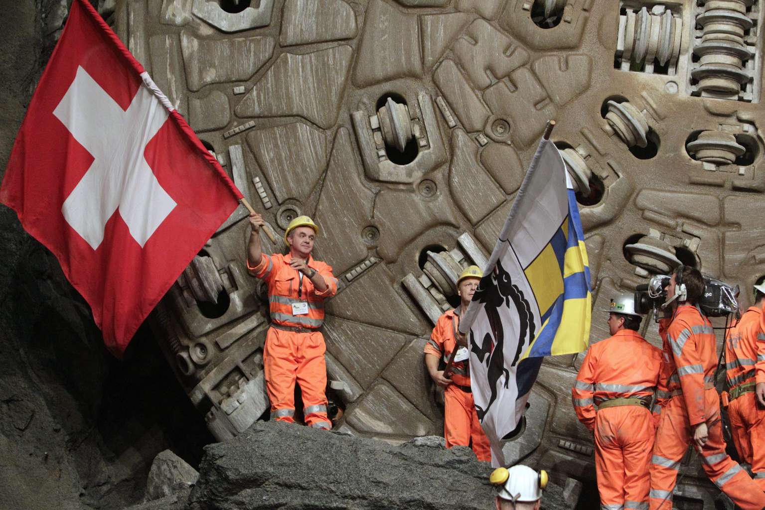 Miners celebrate after breaking through the last section of the Gotthard Base Tunnel.