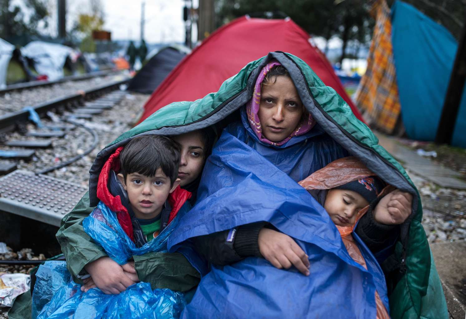A woman and her children waiting to cross the Greece-Macedonia border in the rain on Nov 27.