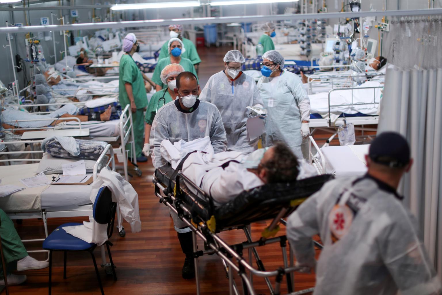 A Covid-19 patient is transported at a field hospital set up in Sao Paulo, Brazil, on April 7, 2021.