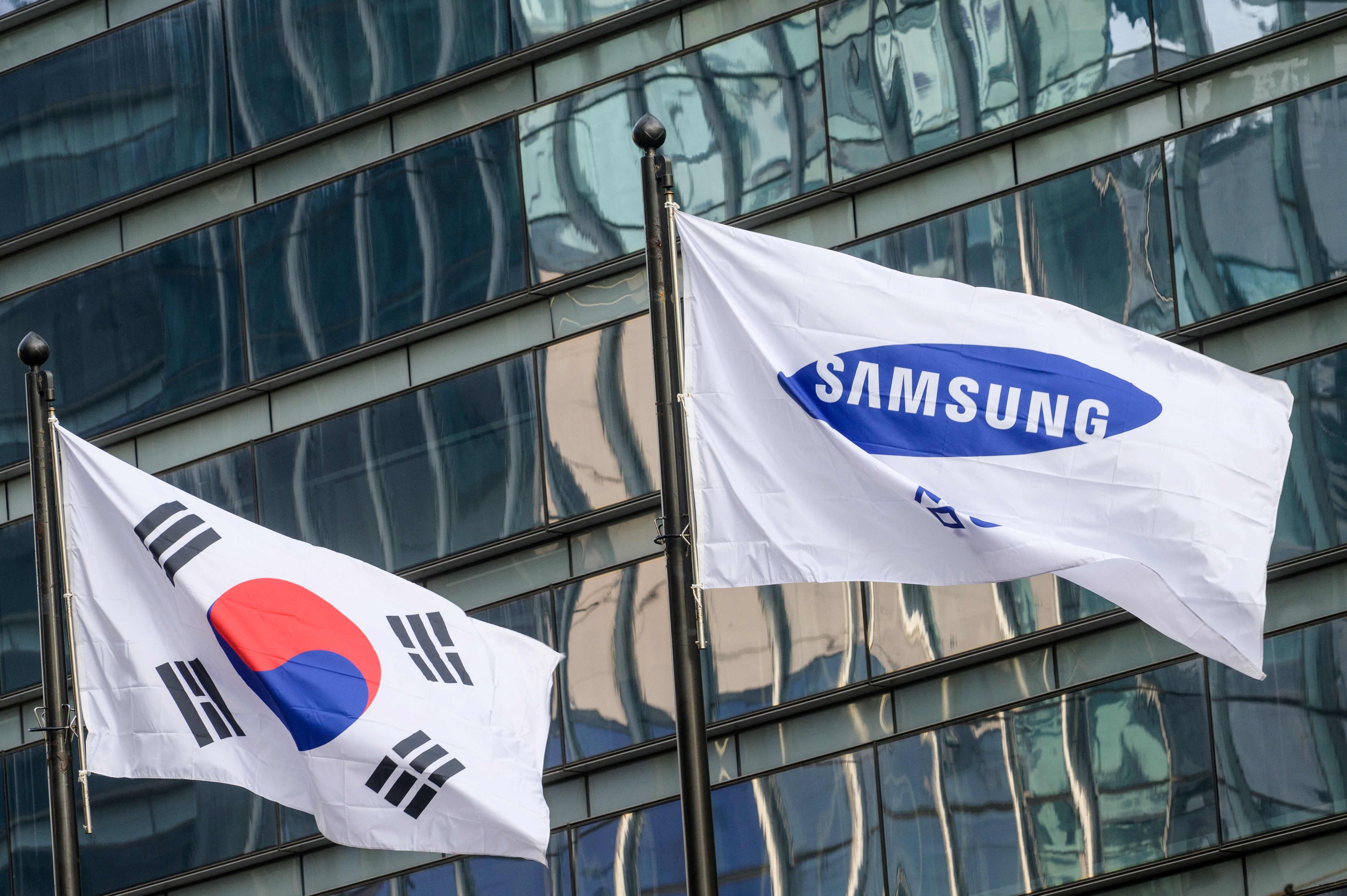 The flags of South Korea (left) and Samsung are seen outside the company's Seocho building in Seoul.