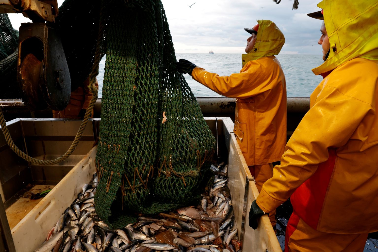 Fishermen empty a net aboard a trawler in the North Sea, off the coast of northern France, on Dec 7, 2020..