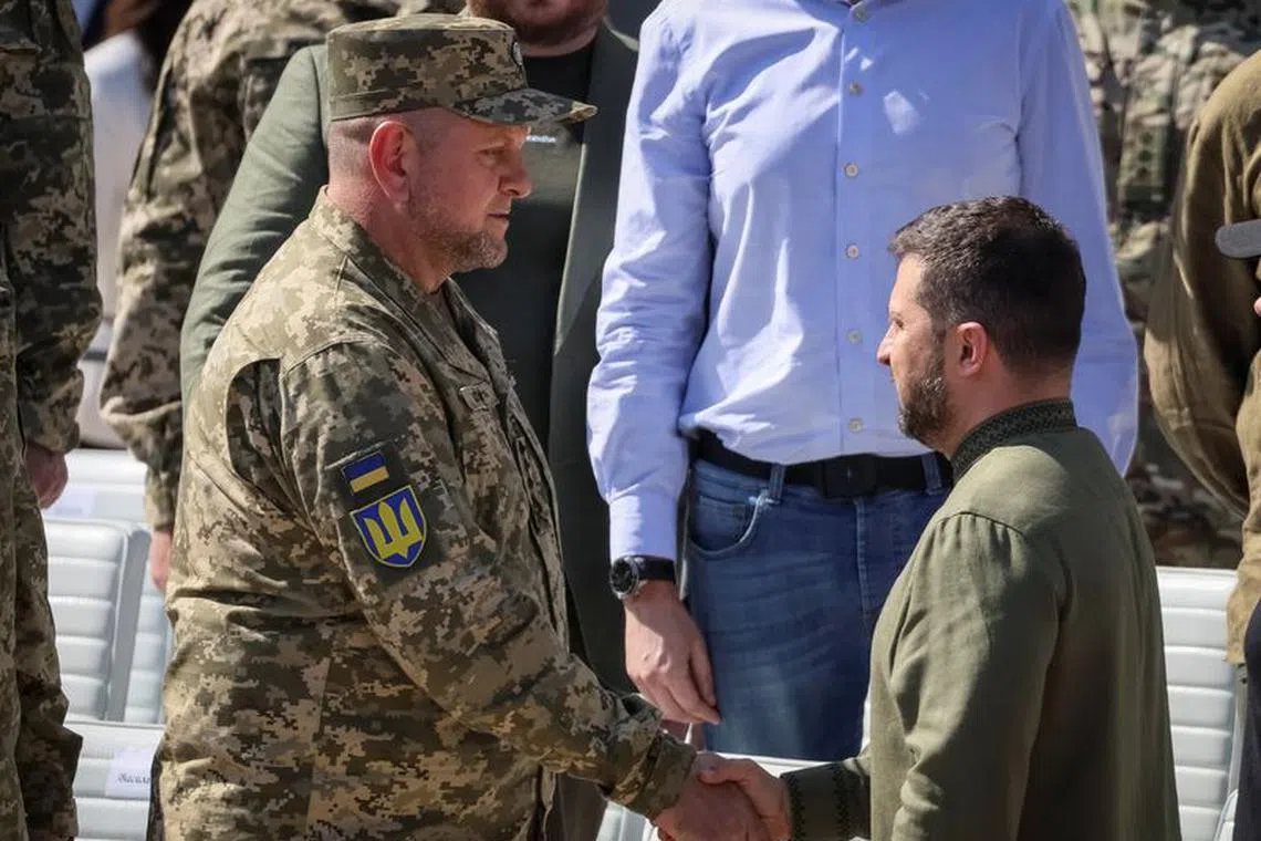 Ukraine’s President Volodymyr Zelenskiy welcomes Commander in Chief of the Ukrainian armed Forces Valerii Zaluzhnyi.