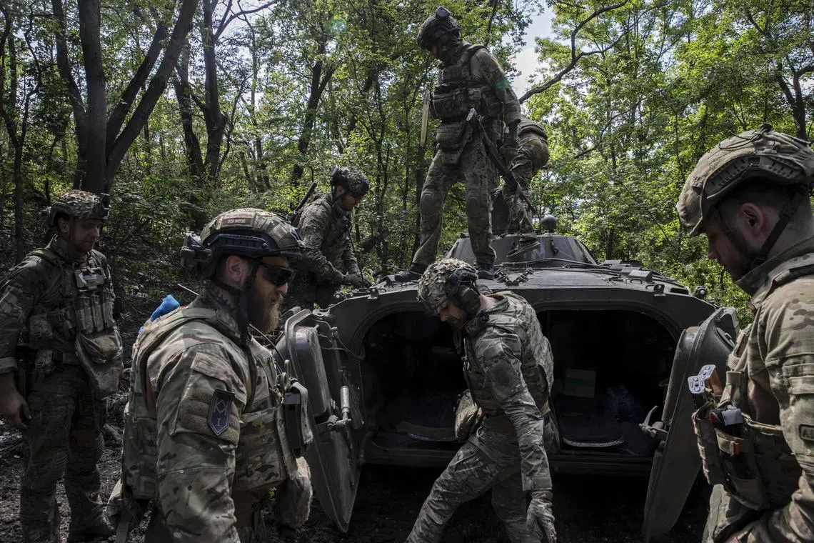 Members of the 3rd Separate Assault Brigade of the Armed Forces of Ukraine with a BMP armored vehicle at the front line south of Bakhmut, Ukraine.