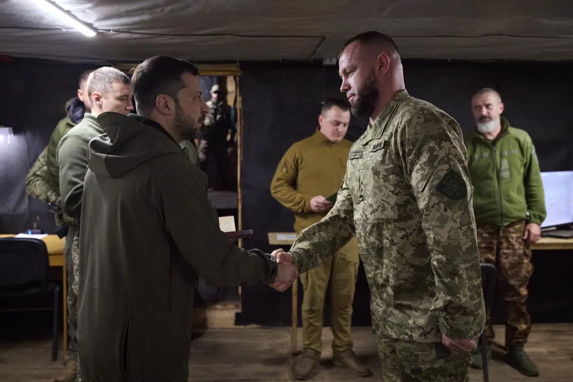 Ukrainian President Volodymyr Zelensky (left) presenting an award to a serviceman during a visit to Ukraine’s Donetsk region on March 22.