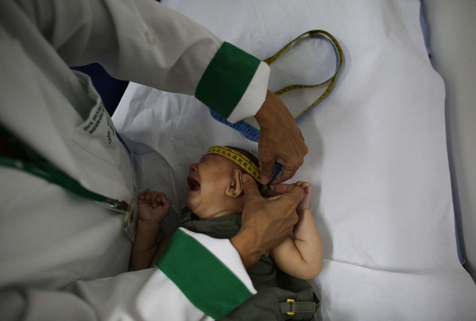 A baby born with microcephaly - thought to be cause by the Zika virus - has her head measured by a neurologist.
