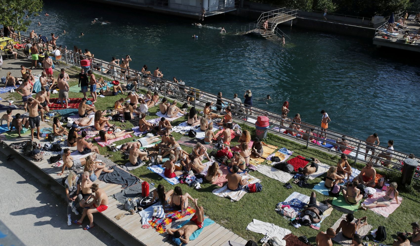People enjoy hot summer weather on the banks of the Limmat river in Zurich, June 27, 2020.