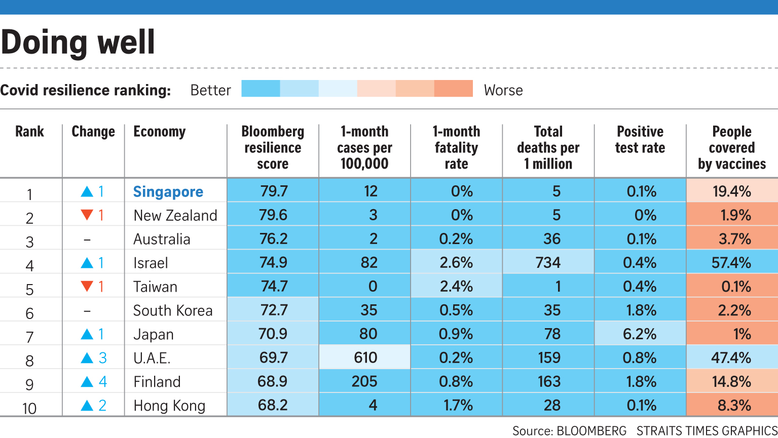 HONG KONG • A combination of nailing the virus and rolling out vaccines at one of Asia's fastest rates has put Singapore on top of Bloomberg's Covid-19 resilience ranking this month, dethroning New Zealand for the first time in a measure of the world's best and worst places amid the pandemic.