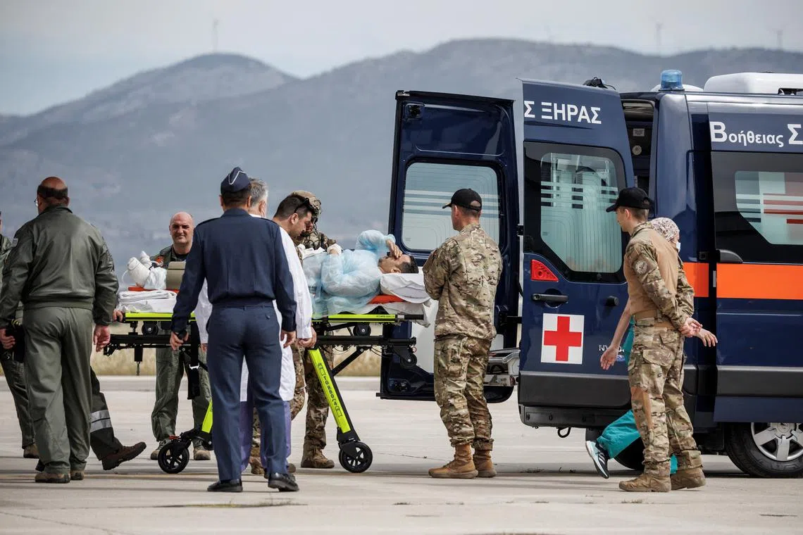 An injured Greek, who was evacuated from Sudan, is being transferred after arriving at a military airport in Greece on April 25.
