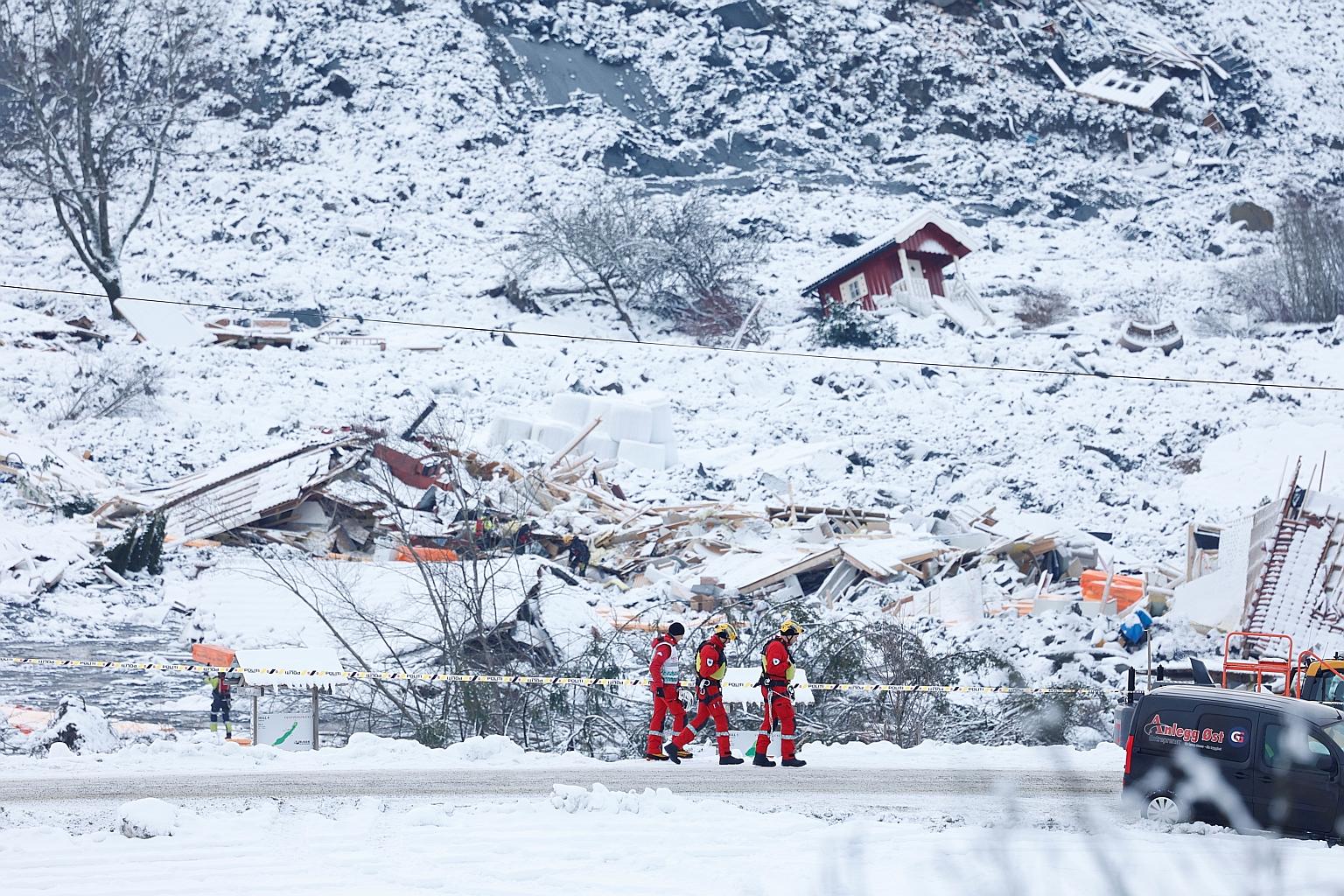 Rescue workers walking past houses destroyed at the landslide area in the village of Ask, located 25km north-east of Oslo, on Saturday. About 1,000 residents have been evacuated.