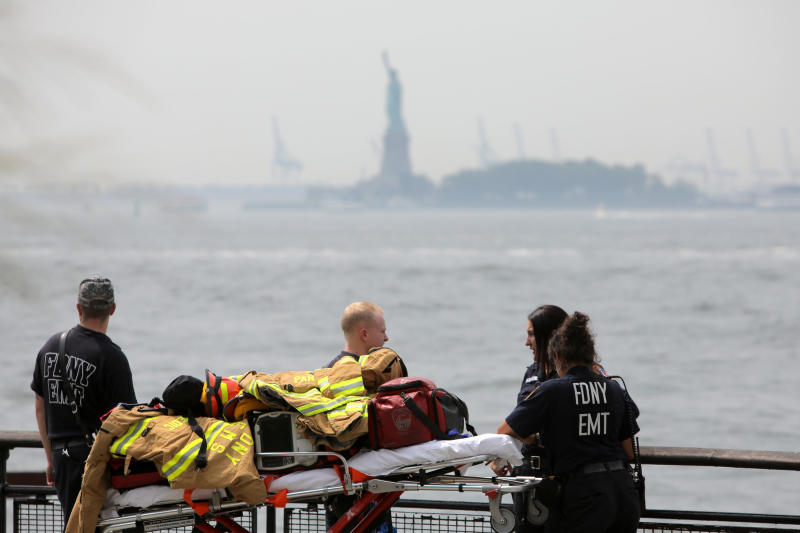 Emergency crews wait near the docking area for the Statue of Liberty after a fire broke out on Liberty Island forcing an evacuation in Manhattan, New York, US, on Aug 27, 2018.