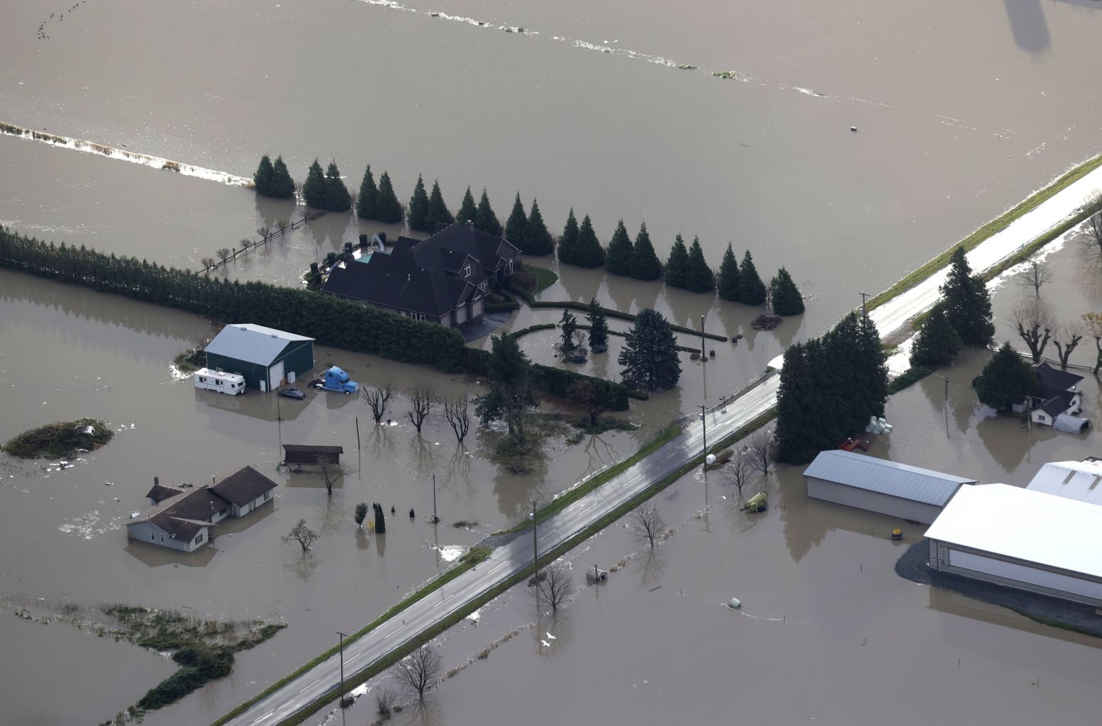 Foodwaters surround homes and farms on Nov 20, 2021, in Abbotsford, British Columbia.