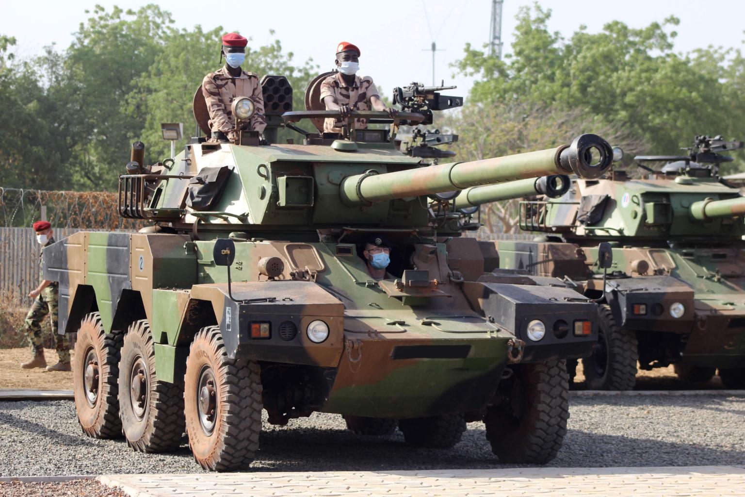 Chadien soldiers are seen on a light armoured vehicle given to Chad by France on Jan 23, 2021.