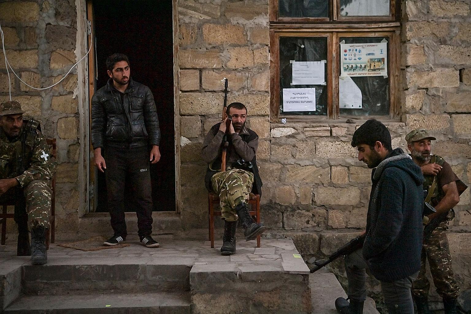 Volunteer fighters at a village south-east of Stepanakert in Nagorno-Karabakh on Friday. Local officials accused Azerbaijan's forces of firing missiles into residential buildings in Stepanakert, the largest city in the region, which Baku denied. Azerbaijan's defence ministry said the areas of Lachin and Gubadli had come under rocket and artillery fire from inside Armenian territory.