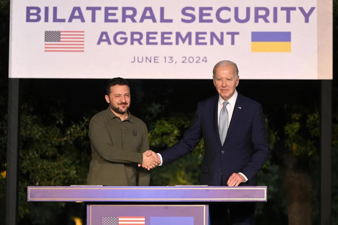 Ukrainian President Volodymyr Zelensky and US President Joe Biden signing a security agreement after a bilateral meeting on the sidelines of the G7 summit in Italy on June 13.