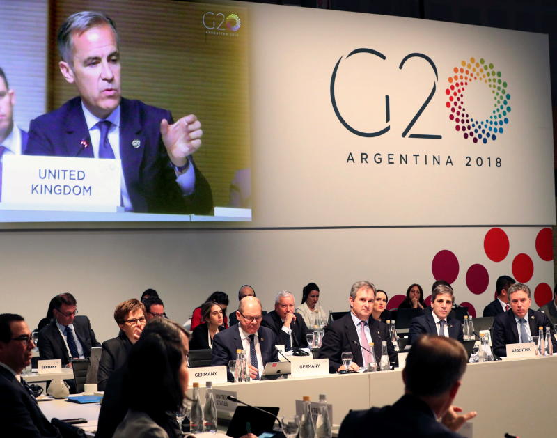 Governor of the Bank of England Mark Carney (front row and on screen) during a meeting of the Group of 20 (G-20) Finance Ministers and Central Bank Governors, in Buenos Aires, Argentina, on July 22, 2018.