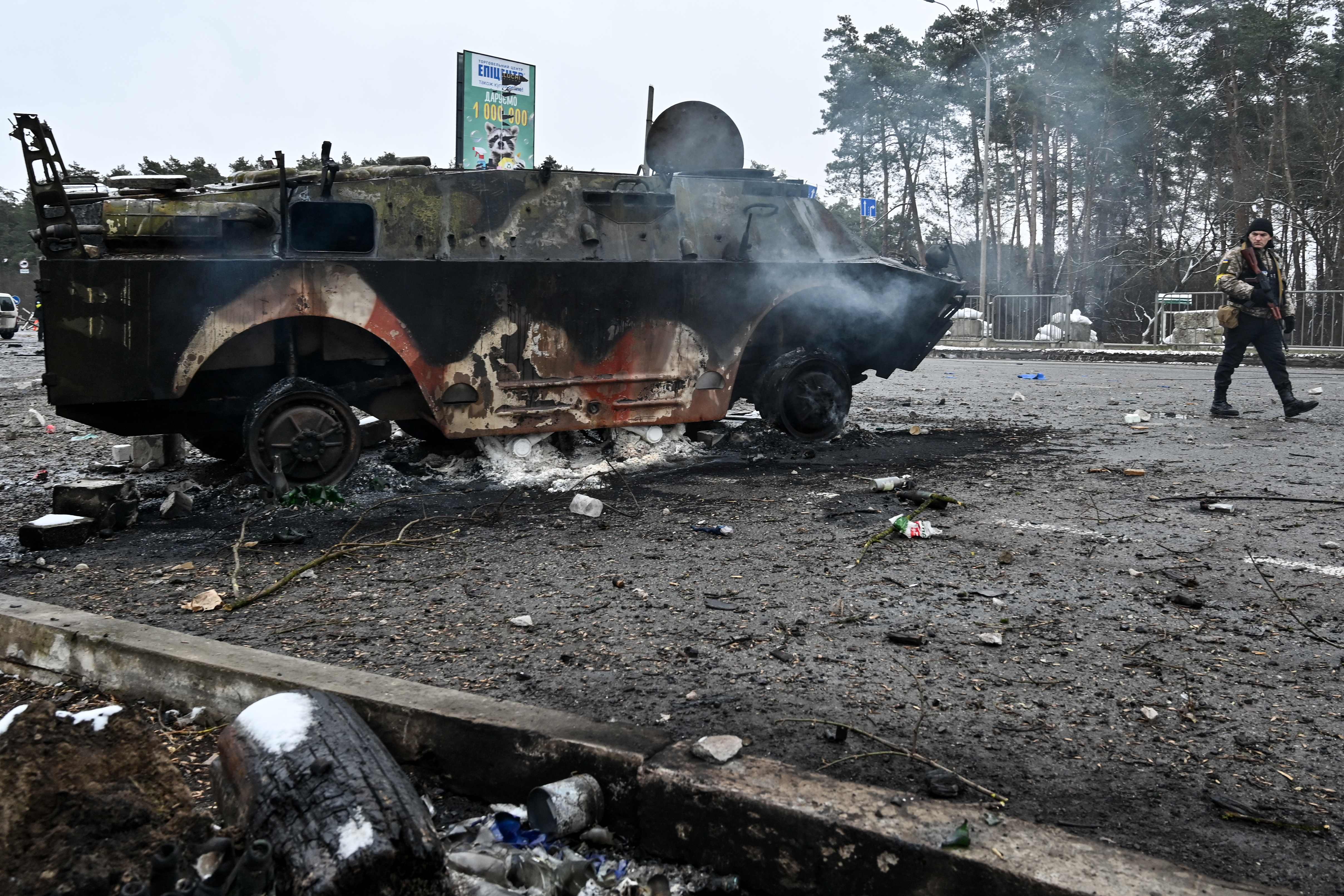 An armed man walks past a burned armoured personnel carrier at a check-point in the city of Brovary, outside Kyiv, on March 1, 2022.