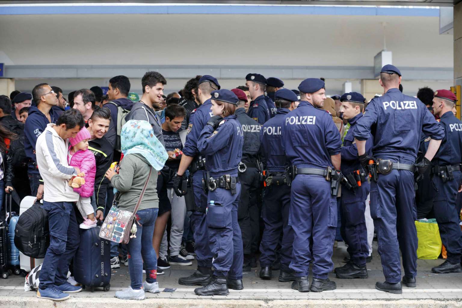 Migrants stand next to police on a platform after arriving at a railway station in Vienna, Austria, on Sept 5, 2015. Austria and Germany threw open their borders to thousands of exhausted migrants on Saturday.