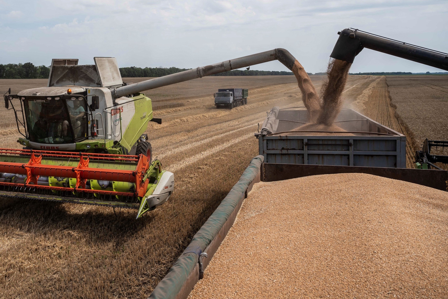 Combine harvesters loading a truck with wheat in a field near the village of Tomylivka in the Kyiv region on Aug 1.