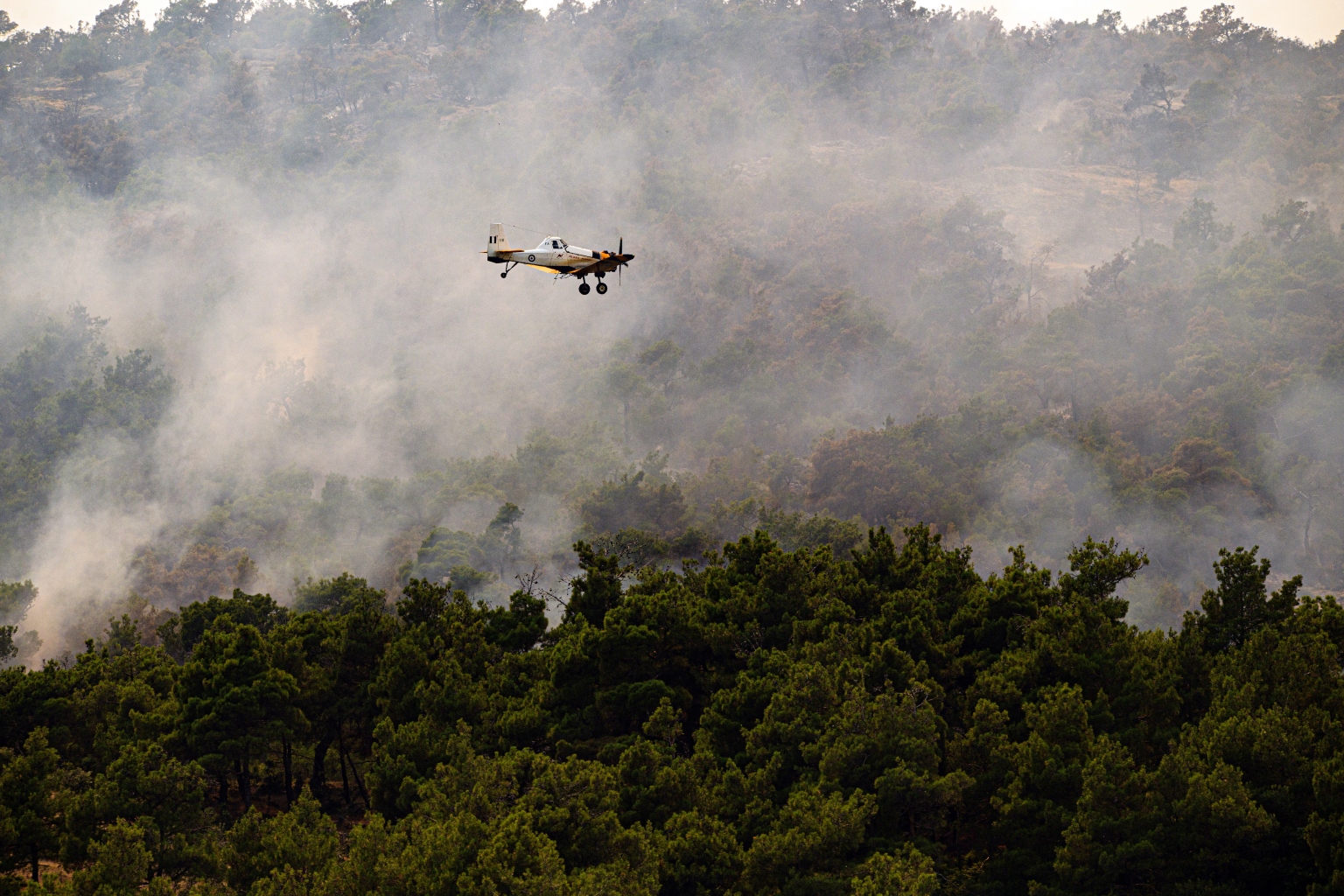 A firefighting aircraft extinguish a forest fire in the Dadia National Park, in Evros, northern Greece, on July 24, 2022.