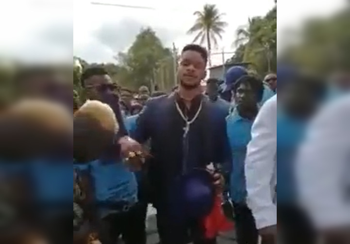 The speaker in the video, dressed in a purple suit, is identifiable as the man known in Haiti by the alias Lamo Sanjou, the leader of the 400 Mawozo gang.