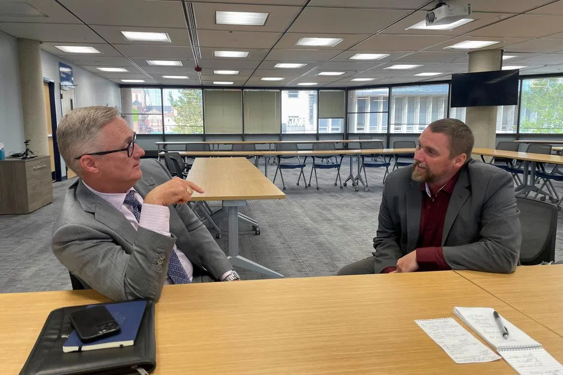 Springfield Mayor Rob Rue (left) talking to city manager Bryan Heck in Springfield, Ohio.
