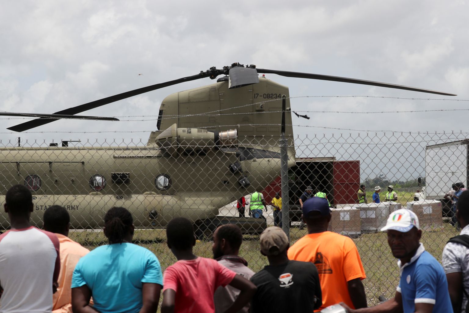 Residents look on as workers receive humanitarian aid from a US helicopter at Les Cayes airport, on Aug 18, 2021.