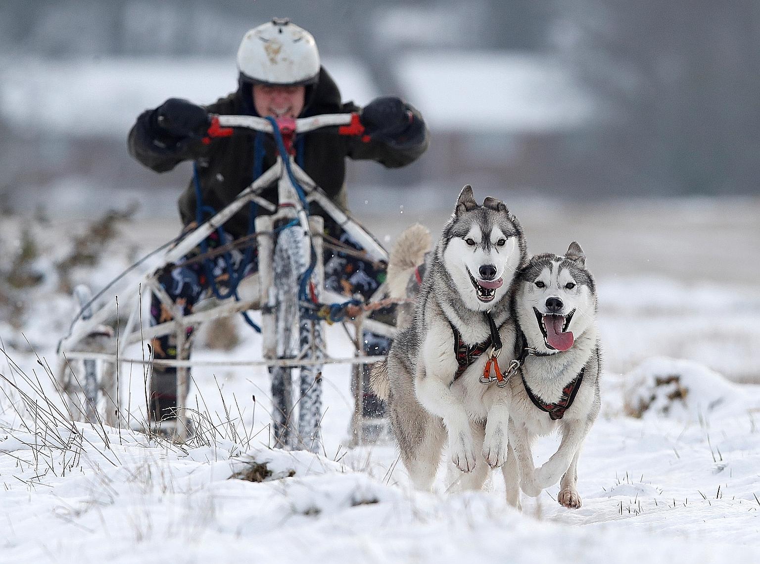 A musher, who drives the sled, put these huskies through their paces during a training session in the English village of Chelford on Tuesday.