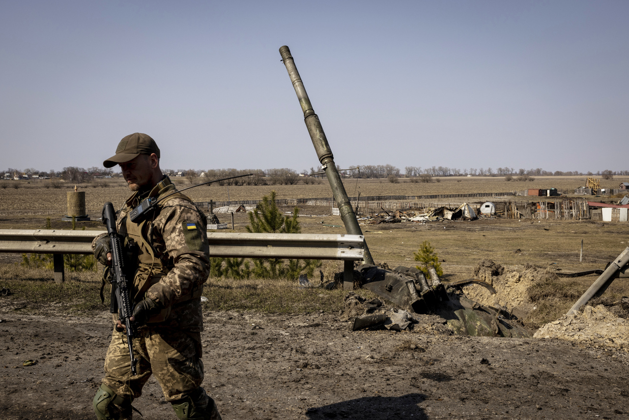 A Ukrainian soldier on the site of a destroyed Russian tank in Kyiv, Ukraine, on March 24, 2022.