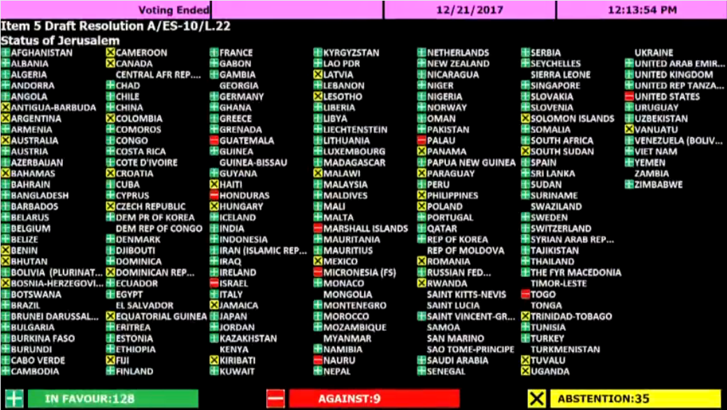 More than 120 countries voted in favour of a resolution calling for the United States to drop its recent recognition of Jerusalem as Israel's capital.