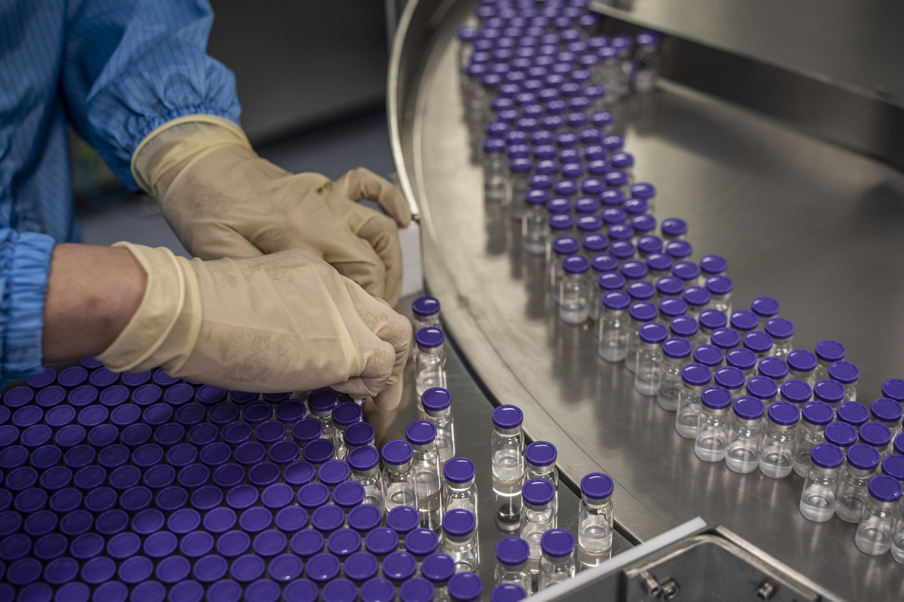 Workers at BioNet-Asia inspect a vial packing machine where mRNA Covid-19 vaccines will be produced at a factory in Ayutthaya, Thailand on Oct 7, 2021.