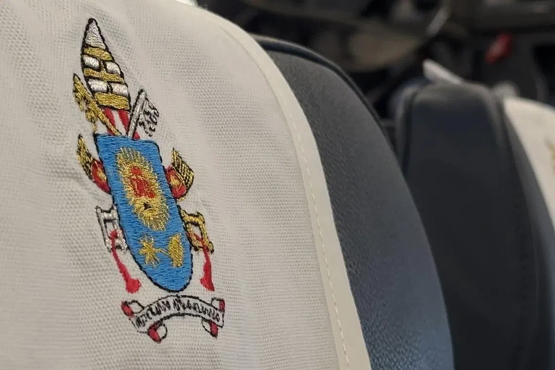 Pope Francis' coat of arms embroidered onto the headrest covers of the papal flight operated by ITA Airways.