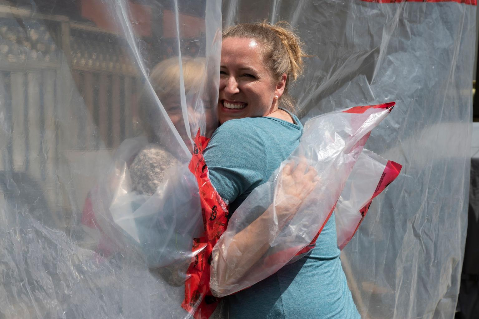 They taped plastic sleeves to a large tarp, allowing two people to hug each other without making direct contact.