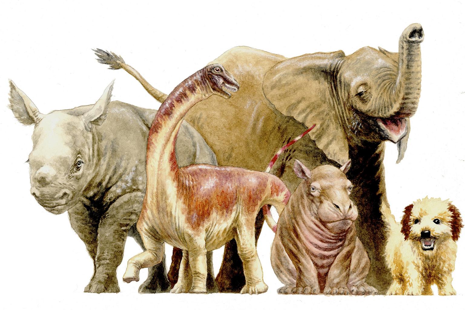 An artist's illustration comparing the sizes of a newborn Rapetosaurus (second from left) to other large-bodied mammalian newborns.