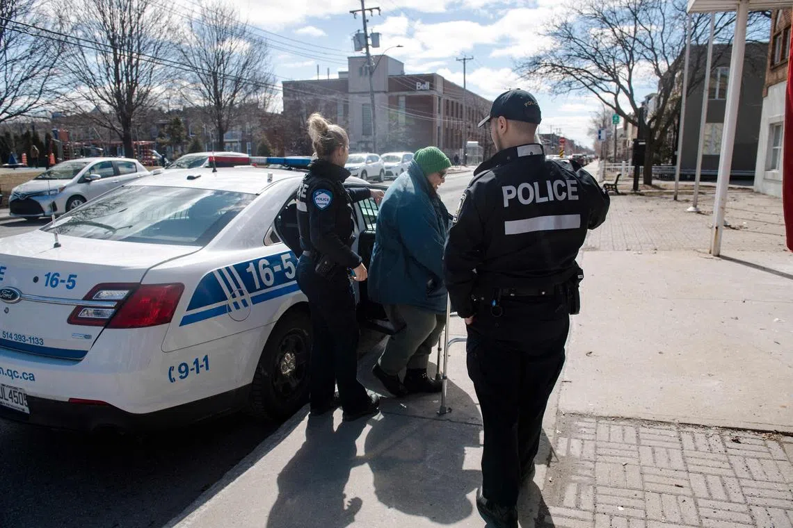 Police officers helping an elderly woman get to an emergency shelter in Verdun, Canada.