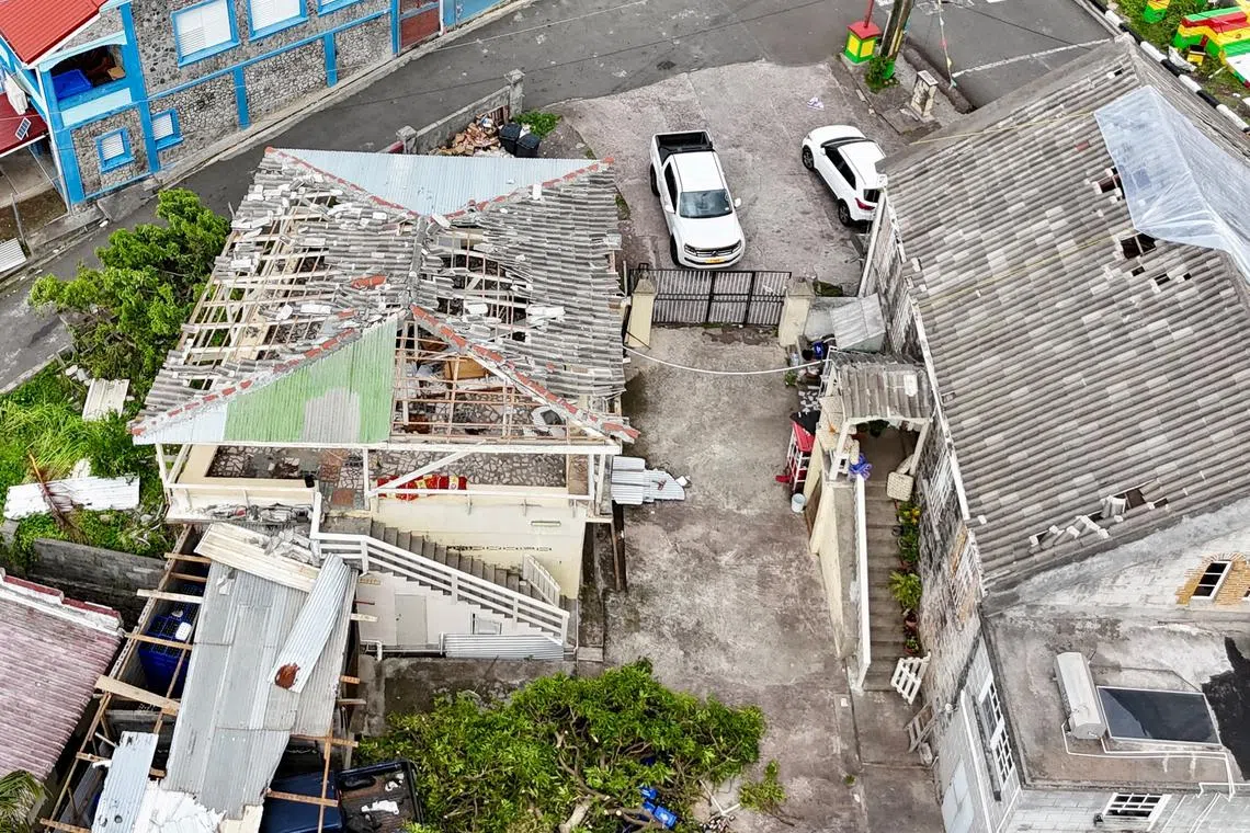 Buildings with damaged roofs after Hurricane Beryl passed the day before, in the northern Saint Patrick parish town of Sauteurs, Grenada, on July 2, 2024.