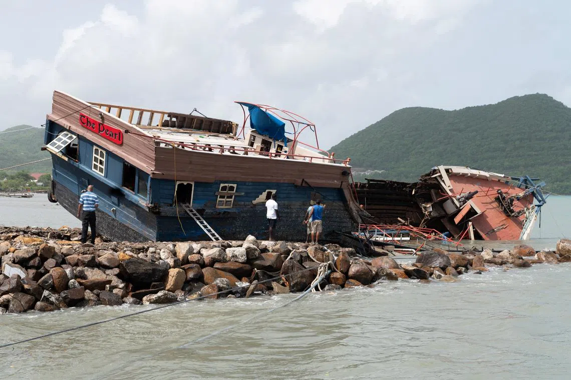 The “pirate” party boat The Pearl stuck on rocks after Hurricane Beryl passed in Gros Islet, St Lucia, on July 2, 2024.